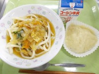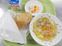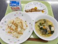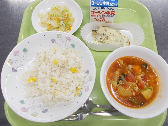 今日の給食は「コーンライス・たらのマヨネーズ焼き・バジルドレッシングサラダ・ABCトマトスープ・牛乳」です。