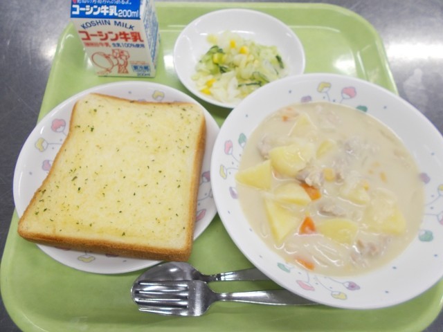 今日の給食は「ガーリックトースト・白いんげん豆のミルクスープ・グリーンサラダ・牛乳」です。