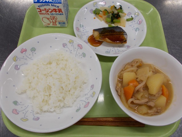 今日の給食は「ごはん・さわらの照り焼き・おみ漬け・みそ肉じゃが・牛乳」です。