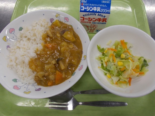 今日の給食は「秋のカレーライス・コールスロー・牛乳」です。