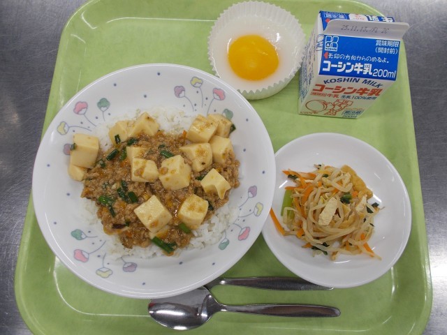 今日の給食は「マーボー豆腐丼・もやしのピリ辛炒め・びっくり目玉焼き・牛乳」です。