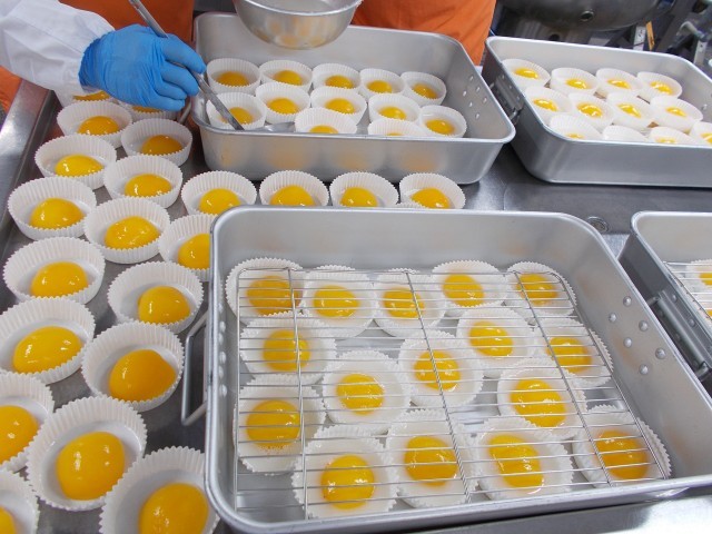 給食室では調理員さんが黄身の部分にカルピスゼリーがかからないように、ゼリー液を流し入れてくれました。そうすることで、ももの部分の色がよく見えて、鮮やかな目玉焼き仕上がりになりました。
