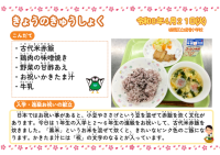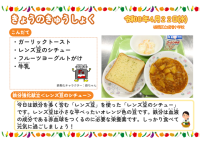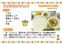 読書週間コラボ給食です。「ハリーポッターと賢者の石」という本から、魔法学校の新入生歓迎会のシーンに登場する料理が登場です!「ポークチョップ」は骨付きの豚肉を焼いた料理です。給食ではアレンジして、豚のこま肉をケチャップで味付けして作りました。「フレンチフライ」はフライドポテトのことです。映画やテーマパークも有名なハリーポッターですが、本もとてもおもしろいので、ぜひ読んでみてください♪
