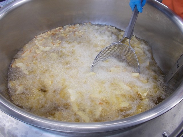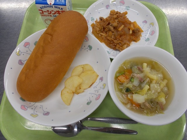 今日の給食は「パンプキンパン・ポークチョップ・フレンチフライ・マカロニスープ・牛乳」です。