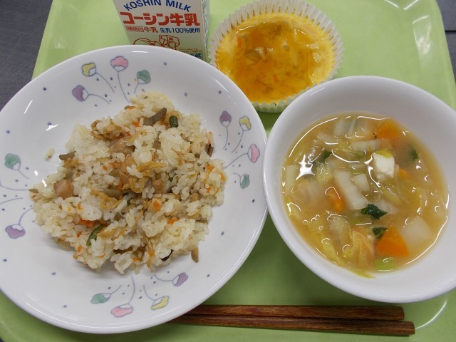 今日の給食は「五目ごはん・あんかけ卵焼き・白菜のみそ汁・牛乳 」です。