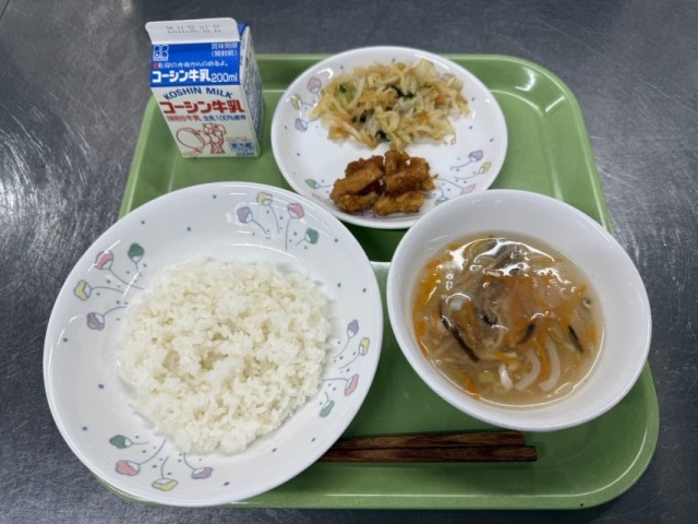 今日の給食は「ごはん・いかのかりんと揚げ・切り干し大根のサラダ・吉野汁・牛乳」です。