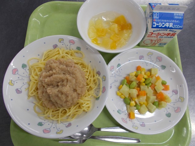 今日の給食は「ツナのおろしスパゲティ・さいころサラダ・フルーツポンチ・牛乳」です。