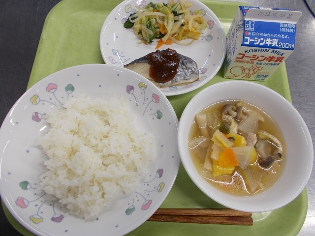 今日の給食は「ごはん・さわらのゆず味噌焼き・野菜の生姜じょうゆ和え・かぼちゃすいとん・牛乳」です。