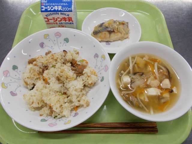 今日の給食は「大根めし・さわらの板橋区産ねぎみそ焼き・うどん入り五目汁・牛乳」です。