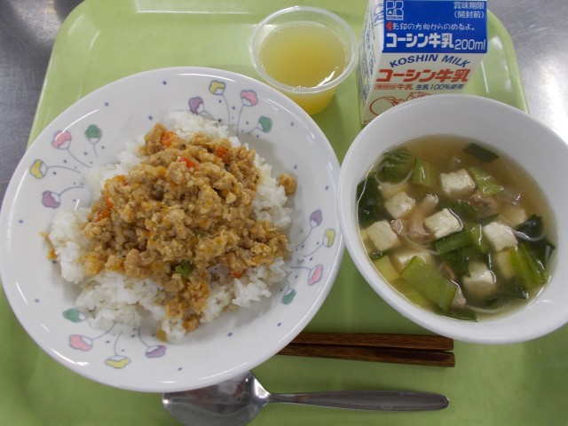 今日の給食は「ガパオライス・ビーフンスープ・パインゼリー・牛乳」です。