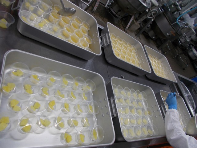 パインゼリーは給食室の手作りでパイン缶をカップに入れ、パインジュースで作ったゼリー液を流し入れて作りました。「おいしい」と好評でした。