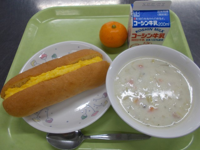 今日の給食は「たまごドッグ・米粉入りクリームスープ・みかん・牛乳」です。