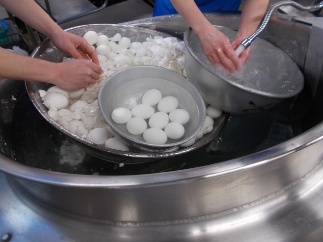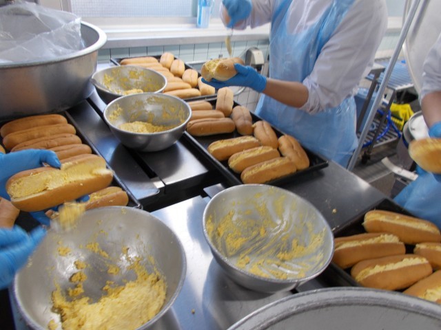 たまごをゆでて殻をむいて、刻んで、玉ねぎとマヨネーズを和えて具を作りました。その具をコッペパンにはさんでオーブンで焼きました。今日はおよそ400個(28kg)の卵を使って作りました。とても手間のかかる料理です。卵はたんぱく質、脂質、ビタミンDなどいろいろな栄養素がバランスよく含まれています。しっかり食べましょう♪