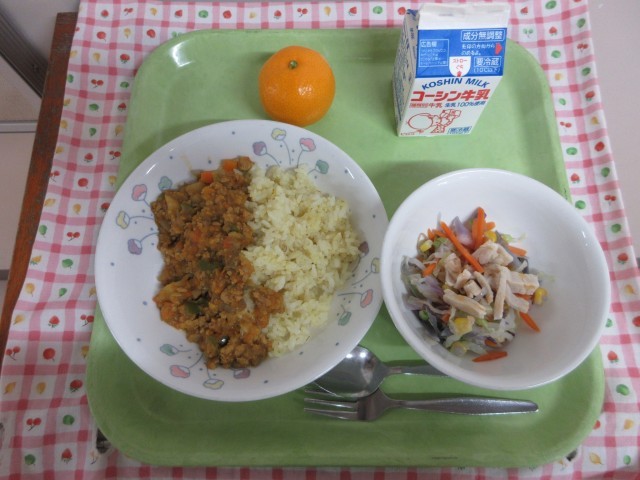 11月17日の給食 公開日 2025/11/18 更新日 2025/11/18 給食献立 【学習発表会 音楽 おうえん献立(2年生)】牛乳♪ドライカレー♪レインボーサラダ♪みかん※写真は低学年の量です。
