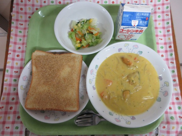 11月21日の給食 公開日 2025/11/26 更新日 2025/11/26 給食献立 【学習発表会 音楽 おうえん献立(6年生)】牛乳セサミトースト♪シンデレラのクリームスープフレンチサラダ※写真は低学年の量です。