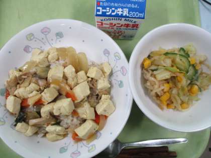 牛乳 麦ごはん 豆腐のカレー煮 大根サラダ