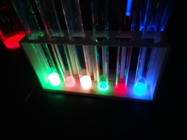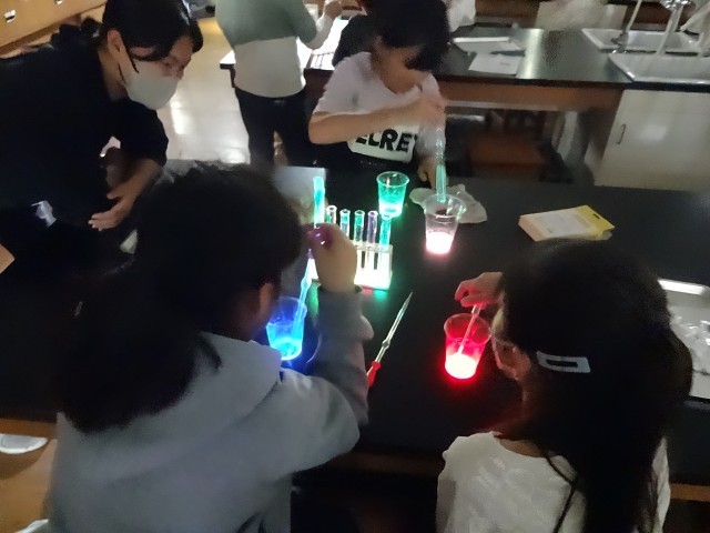 暗い教室の中、試験管やカップを使って、赤・青・緑などに光る水を作りました。子どもたちは「わあ、きれい!」「どうして光るんだろう?」と目を輝かせながら活動に取り組みました。光の色の混ざり方や、光の強さによる見え方の違いにも興味をもち、科学のふしぎさを実感する時間となりました。教室いっぱいに広がる色と光に、歓声と笑顔があふれていました。