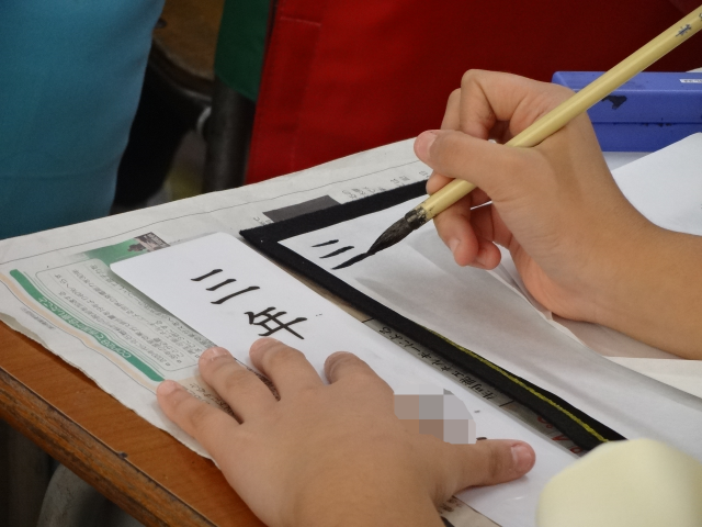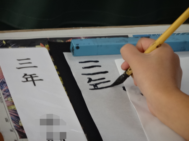 子どもたちは、これまで使ってきた大筆との違いに気づきながら、筆の持ち方や力の入れ方を丁寧に確かめていました。最初は細い線を書くのが難しかったようですが、練習を重ねるうちに少しずつ筆づかいにも慣れ、集中して取り組む姿が見られました。