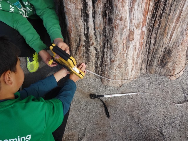 これまで使ってきたものさしでは測れない長いものを、巻き尺を使って測る学習を行いました。教室の黒板や廊下の長さ、木の周りの長さなど、学校の中のいろいろな場所を実際に測ってみました。