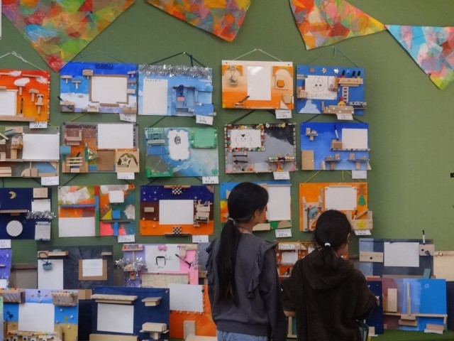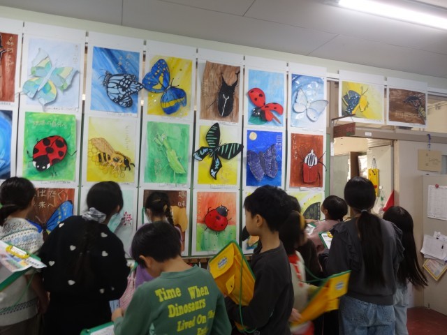 子どもたちはクラスごとに会場を回り、他学年の作品をじっくりと鑑賞しました。「こんな作り方があるんだ」「色の使い方がすてき!」など、友達や上級生の作品からたくさんの発見や学びがあり、作品を見ながら感想を語り合う姿が多く見られました。
