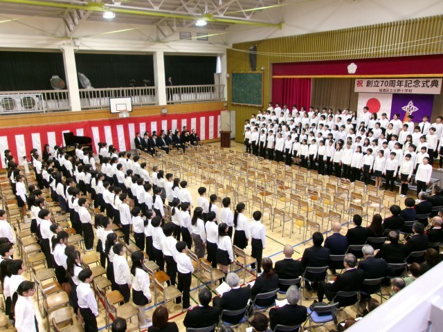 式典は、副校長先生の司会のもと進行し、まず「開式の言葉」「国歌斉唱」を行いました。続いて、校長先生より式辞が述べられ、70年間の学校の歩みと、地域に支えられながら成長してきた北野小学校の歴史が振り返られました。