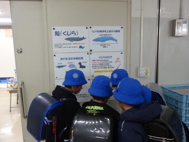 また、仕入れ業者の方からクジラのひげをいただき、給食の時間にあわせて展示しました。実物を目の前にした子どもたちは、「大きい!」「かたいのかな?」と驚きながら、実際に触って感触を確かめていました。