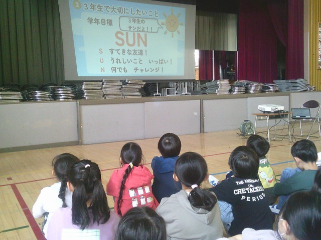 3年生の学年目標は「SUN」です。Sは「すてきな友達!」、Uは「うれしいこと、いっぱい!」、Nは「何でもチャレンジ!」という意味が込められています。1年間を通して、学校に行くのが楽しい!と思えるよう担任一同サポートしていきます。3年生の終わりに自分の成長を実感できるようになってほしいと願っています。