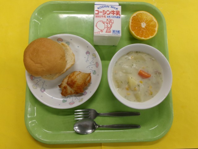 牛乳 タンドリーチキンバーガー 米粉のシチュー みかん