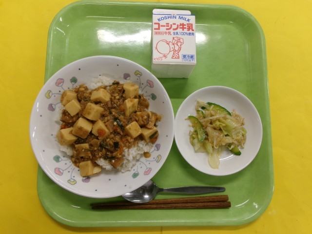 今日の給食は「中華」です。マーボー豆腐丼は給食の定番メニューで子供たちからも人気があります。給食のマーボー豆腐丼は、豆腐をたっぷりと使います。ひとり分約120g、成増ヶ丘小学校全体で90kgもの量になります。豆腐の他にも豚ひき肉や大豆のみじんぎりも入り、たんぱく質がしっかり摂取できます。マーボー豆腐丼も和え物も、今日はほとんどのクラスで完食していました。朝晩は冷え涼しくなってきたので、給食をしっかり食べて風邪などひかぬよう、体力をつけてほしいと思います。
