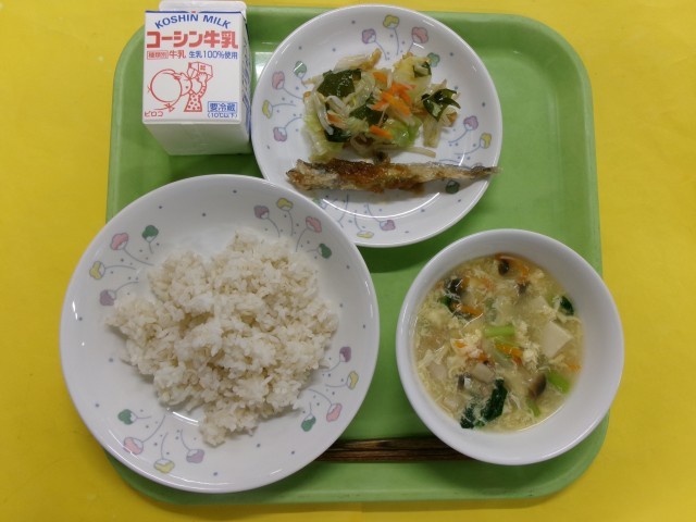 牛乳 ごはん ししゃもの南蛮揚げ カリカリ油揚げのサラダ 長野県駒ヶ根市産しめじと卵のすまし汁