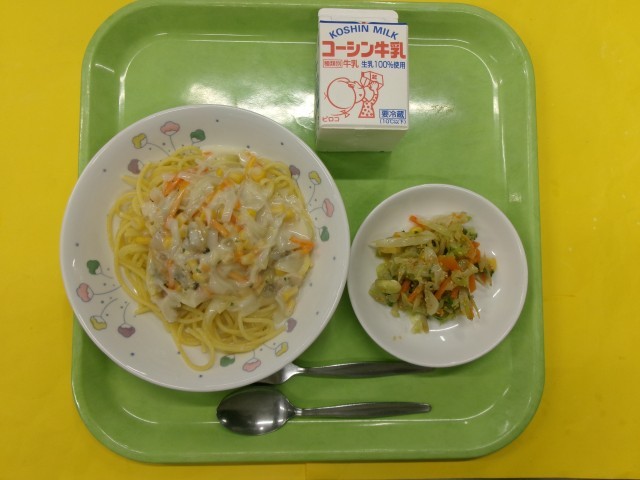 今日の給食は、鉄たっぷりの食材「あさり」が入ったクリームスパゲティです。秋も深まり寒くなってきたので、クリーム味が美味しい季節になってきました。あさりの他にも玉葱やえのきたけなどが入っています。