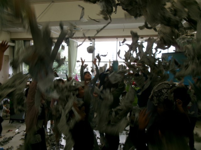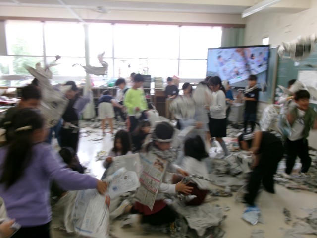 図工の学習で、新聞紙を折ったり、ねじったり、丸めたり、とても楽しそうに活動していました!