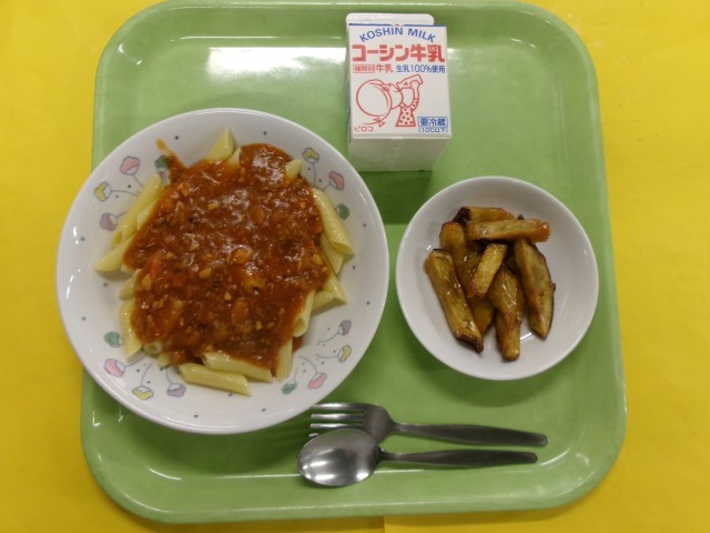 「ボロネーゼ」は、イタリアの都市ボローニャ発祥のパスタ料理です。トマト・ひき肉・玉葱などの野菜類を煮込んだ料理でパスタにからめながら食べます。本場イタリアでは、きし麺状のパスタである「タリアッテレ」が使われるそうです。今日の給食では、タリアッテレではなく、ショートパスタの「ペンネ」を使用しました。普通のスパゲティ麺よりも、もちもちとした食感が特徴で食べ応えがあります。2年生の教室に行くと、ペンネを指さして「これなに?めん?」と聞いてくる児童も居て、ペンネに興味津々の様子でした。スティックスイートポテトも人気で、子供たちも美味しそうに食べていました。
