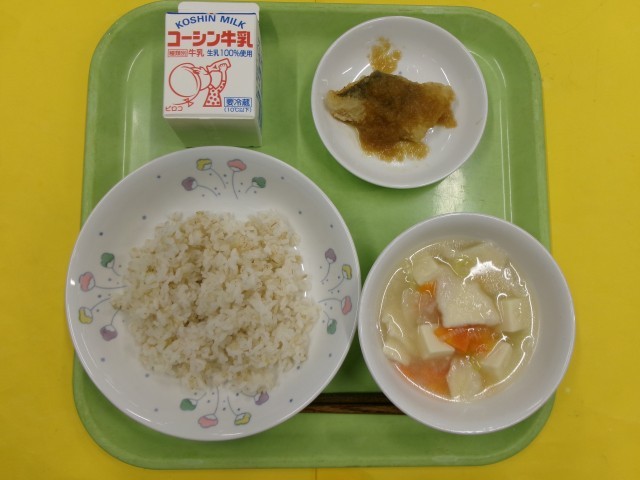 牛乳 七穀ごはん 白身魚の玉ねぎソース せんべい汁
