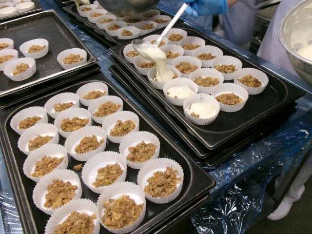「あんかけうどん」は、鶏肉や大根、白菜、長ねぎなど冬野菜が入った具だくさんのうどんです。 とろみが付いているので、寒い冬にぴったりのメニューです。「肉まん風蒸しパン」は、名前の通り、豚ひき肉やたけのこを炒めて具を作り、その上に小麦粉とベーキングパウダーで作った生地をのせ、スチームオーブンで蒸しました。成増ヶ丘小学校は人数が多いので、今日のような個数ものは手間も時間もかかりますが、調理員さんが朝早くから準備をし、手際よく作ってくれました。冬ならではのあったかメニューに、子供たちも「うどんだ~!!」と喜んで食べていました。