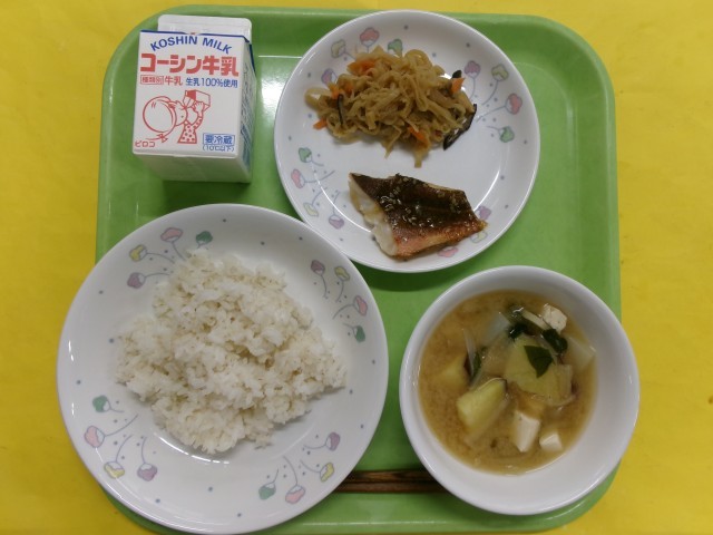 牛乳 ごはん 魚のごまだれ焼き 切り干し大根の含め煮 さつまいものみそ汁