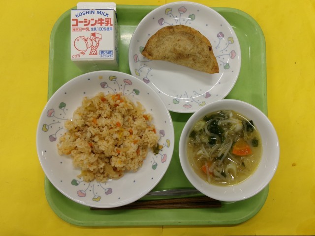今日の給食は、成増小学校、赤塚第二中学校、成増ヶ丘小学校、3校で同じメニューを提供する「学びのエリア給食」です。「キムタクチャーハン」は、人気メニューのひとつで、キムチ、焼き豚、たくあんが入った混ぜご飯です。「ジャンボギョウザ」は、具材を餃子の皮に包み、油で揚げた揚げ餃子です。にらやにんにく、生姜などスタミナが付く野菜が入っています。成増ヶ丘小学校は人数が多いので、770個もの餃子を調理員さんがひとつひとつ、ていねいに作ってくれました。「中華スープ」は、鶏肉やもやし、わかめなどが入った具だくさんのスープになっています。