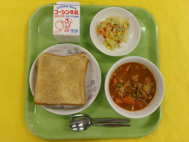 「セサミトースト」は、練りごまやすりごまをグラニュー糖と混ぜ合わせてパンに塗りオーブンで焼きました。パンの耳が硬くならないよう、やわらかめに仕上げました。「豚肉と野菜のデミグラスソース煮」は、豚肉やじゃがいも、エリンギなどをデミグラスソースとトマト系調味料でじっくりと煮込みました。パンに合うシチューです。今日はどの学年もよく食べていて、パンもスープもサラダも全て完食しているクラスが多くありました。