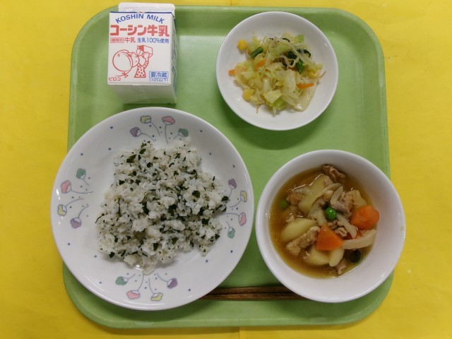 「わかめごはん」は子供たちも大好きなメニューです。「肉じゃが」は、豚肉やじゃがいものほか、油揚げやしめじ、こんにゃくが入った具だくさんの煮物です。じっくりと味がしみ込むように、調理員さんが作ってくれました。「五色あえ」は、人参・小松菜・キャベツ・もやし・コーンの5種類の野菜が入っています。給食では、毎日多くの種類の野菜を使用しているので、ビタミン類やミネラルなど、不足しがちな栄養素を摂取することができます。和食の献立でしたが、完食しているクラスもあり、よく食べていました。