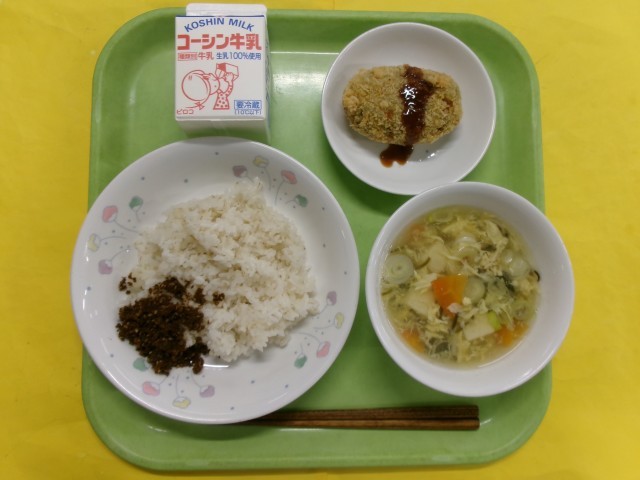 ごはん かつおでんぶ かぼちゃコロッケ かきたま汁