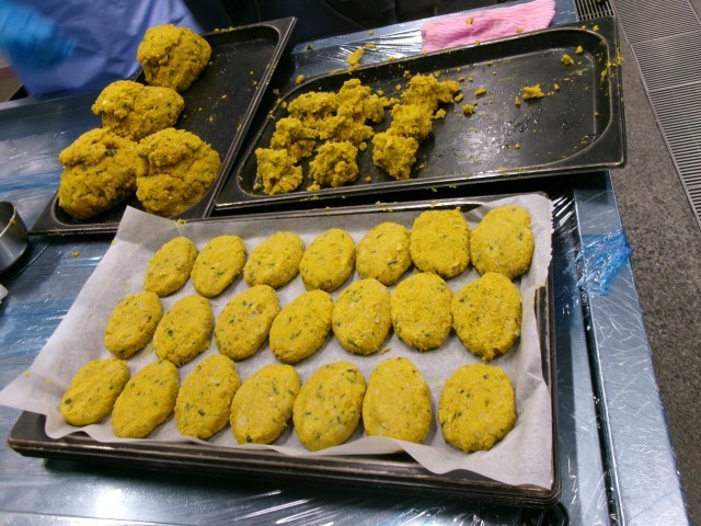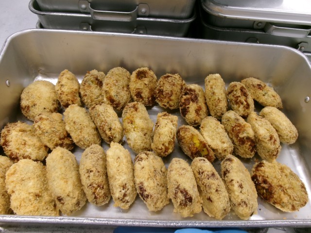 今日、12月22日は「冬至」です。1年で昼の時間が最も短く、夜が長い日です。この日は無病息災を願って「かぼちゃ」を食べたり「ゆず湯」に入ったりします。給食では、かぼちゃがたっぷり入った「かぼちゃコロッケ」を作りました。成増ヶ丘小学校770人分を作るには、40kgものかぼちゃが必要で、調理員さんが朝早くから準備をして、ひとつひとつ丁寧にコロッケを成形し揚げてくれました。