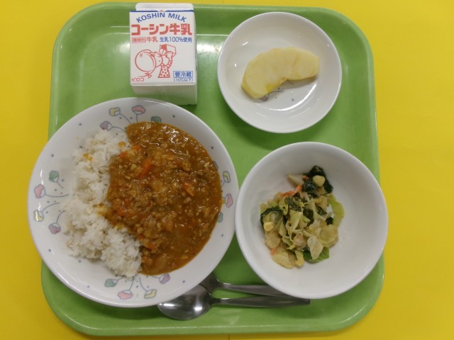 「キーマ」とはヒンディー語で「細切れ肉」や「ひき肉」を意味します。今日の給食では豚ひき肉を使用し、玉葱や人参、セロリなどの他、大豆ミートや大豆のみじん切りが入っています。お肉に野菜、豆類と栄養たっぷりのカレーになっています。カレー粉の量は控えめにしていますが、香辛料のガラムマサラが入っているのでスパイシーな香りがします。カレーは人気メニューなので、どの学年もよく食べていました。