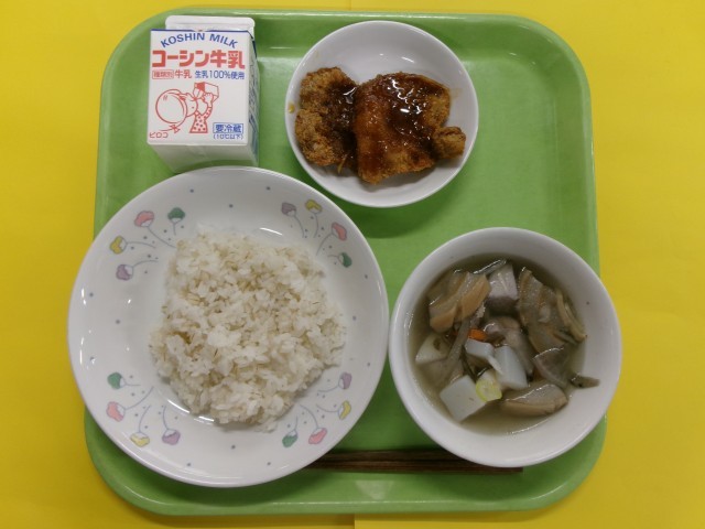 牛乳 ごはん たれカツ 車麩入りのっぺい汁
