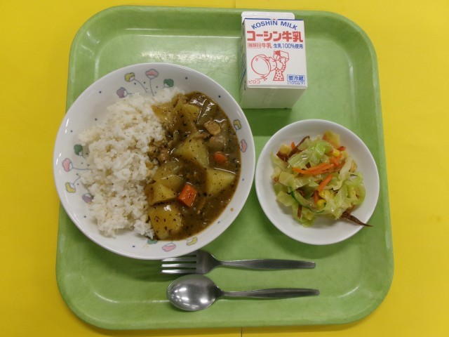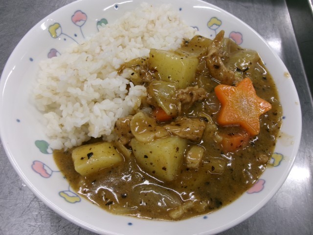 2月最初の給食はカレーです。今日のカレーはひと味違います。ブラックと名が付くカレーなので、黒い食材である「ひじき」が入っています。ひじきを水で戻し、ミキサーにかけて細かくしたものを入れました。ぱっと見て分かるくらいに、黒いつぶつぶがカレーの中に入っています。ひじきにはカルシウムやカリウムなどのミネラル類や食物繊維が多く含まれていています。ひじきの煮物やひじきご飯は子供たちも抵抗があるのですが、今日のようにカレーに入れることで、すんなりと食べてくれます。全体的にカレーはよく食べていたのですが、サラダが余りがちでした。