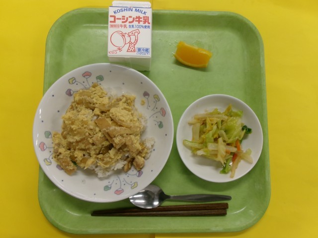 「あぶたま丼」は油揚げがたっぷり入った親子丼です。油揚げは水切りした豆腐を薄く切って油で2度揚げされたものです。揚げることにより、水分が減り、ミネラル類(鉄や亜鉛)が増えます。おひたしには、冬が旬の「白菜」が入っています。給食では一度茹でていますが、白菜の甘みが感じられる和え物です。和え物などのサラダ類は、学年問わず食べるクラスと食べないクラスの差が大きいです。なるべく、多くのクラスで食べてもらえるよう味付けなどを工夫していきたいと思います。