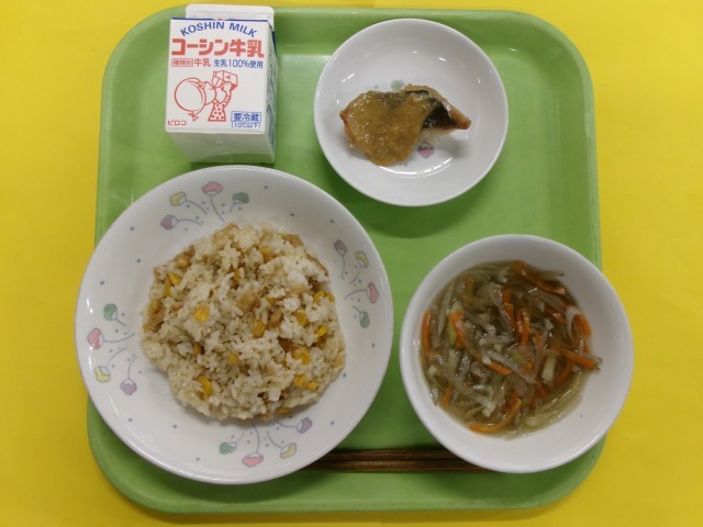 「きつねごはん」は、油揚げとコーンが入った混ぜごはんです。油揚げとコーンはだし汁と醤油、みりんで甘く煮付けてからごはんに混ぜ合わせました。「魚のごまみそ焼き」は、めばるという白身魚を使用しました。めばるは、「春を告げる魚」とも言われて、冬から春においしい魚です。「さわにわん」には、6種類の具材が入っています。和え物が付かない日は、汁物に野菜を多く入れています。