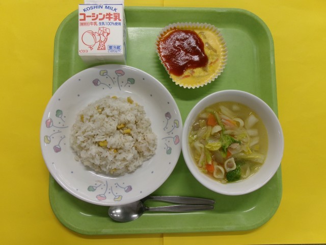 「コーンライス」はバターで炒めたにんにくとコーンをごはんに混ぜ合わせました。「スパニッシュオムレツ」には、ベーコンや玉葱、じゃがいも、人参、ピーマンの5種類の具材が入ったオムレツです。具材と卵を炒め合わせて、カップに入れてオーブンで蒸し焼きにしました。仕上げにケチャップが入ったトマトソースをのせています。個数ものは、低・中・高と学年ごとに大きさや量が違うので手間と時間がかかりますが、調理員さんがいつも丁寧に、均一に作ってくれています。成増ヶ丘小学校の子供たちは、卵料理は好きなので今日もよく食べていました。