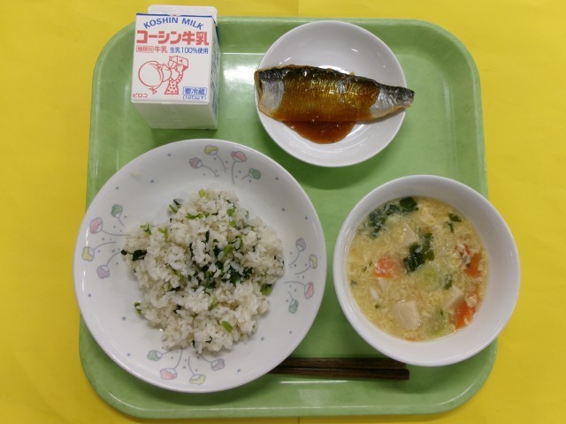 牛乳 菜飯 魚のピリ辛焼き かきたま汁