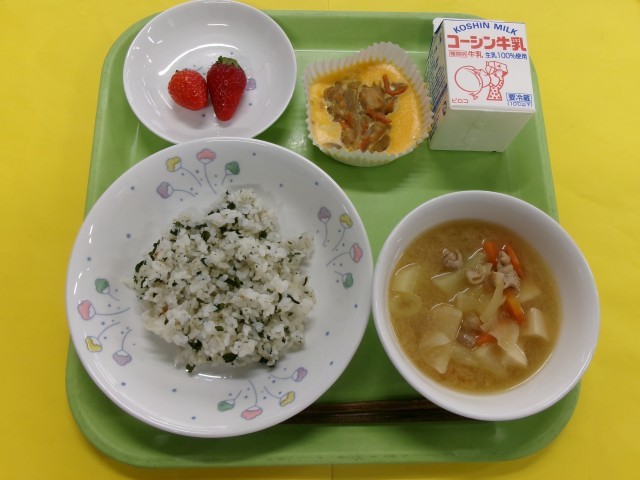 わかめごはん ツナ入り卵焼き 豚汁 いちご2つ