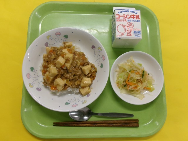 今日は1年生が給食初日です。メニューは食べやすい「マーボー豆腐丼」にしました。豆腐はたっぷり、具材は全てみじん切りにして、みそと醤油で味付けしました。辛さを少し付けるために、高学年用のマーボー豆腐には「一味唐辛子」と「ラー油」を加えています。「バンサンスー」は春雨が入ったサラダです。成増ヶ丘小学校では、1,2位を争う人気サラダです。1年生はどのクラスも、とてもよく食べていて、サラダ好きな子も多くバンサンスーもたくさんの子がおかわりをしていました。